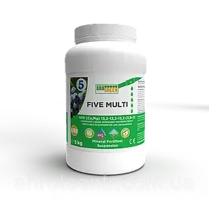 Файв Мульті - це гелевий продукт зі збалансованим складом азоту, фосфору та калію поєднує мезоелементи (Са, Mg) та мікроелементи в одному продукті, що забезпечує рослину всіма необхідними поживними речовинами.